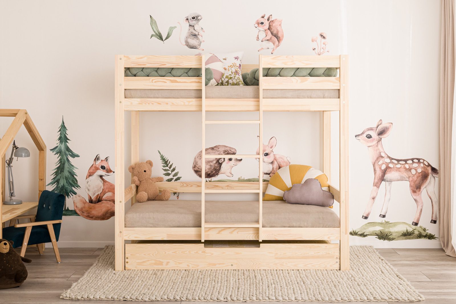 Vous pouvez également ajouter un tiroir spacieux au lit superposé. Le tiroit est doté d’un sommier intégré, ce qui vous permet de l’utiliser comme lit supplémentaire. Il vous suffit d’acheter un matelas d’une hauteur maximale de 12 cm et d’une longueur inférieure de 10 cm à celle du lit.